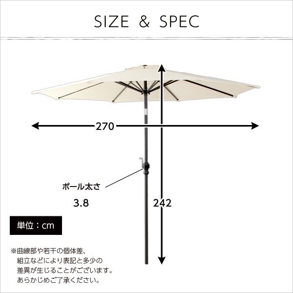 サイズ 外寸:(約)270x270x242cm ※商品重量:(約)5kg カラー アイボリー、ブラウン、グリーン 素材 ポリエステル、アルミニウム その他 ・完成品でのお届けです。 ・梱包サイズ:(約)140×15.5×14.5cm(1.1才) アイボリーのみ:(約)142.5x14x15cm(1.1才) ・梱包重量:(約)6kg