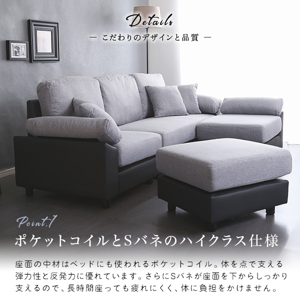 サイズ 【商品サイズ】 197×191×78cm 【商品重量】 63kg 【梱包サイズ】 130×77×52cm(2-1) 73×77×66cm(2-2) 【梱包重量】 68kg (2-1)37kg (2-2)31kg カラー BRBK,GYBK 素材 【構造部材】本体:木製フレーム 脚部:天然木 【張り材】ファブリック、PVC 【クッション材】Sバネ、ポケットコイル、ウレタン その他 組立商品